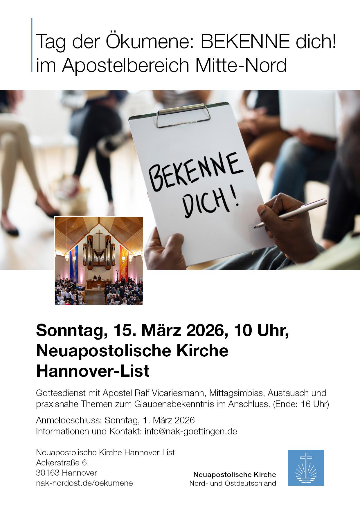 Im Apostelbereich Mitte-Nord fand 2023 der 1. Tag der Ökumene in Hildesheim unter dem Thema "Zeig DICH!" statt. Der vielfältige Austausch, informative Inhalte und die Vernetzung unter engagierten Glaubensgeschwistern und Interessierten führten am Ende des Tages zum Wunsch nach einer Fortsetzung, der nun für 2026 konkret wird.